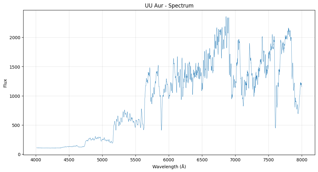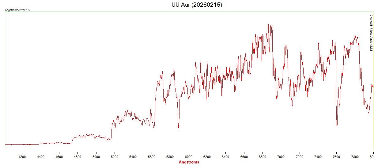 UU Aurigae is a carbon-rich asymptotic giant branch star. The spectral type listed in the General Catalogue of Variable Stars (GCVS) is C5,3-C7,4(N3). The N3 refers back to an older type of classification where carbon stars were given spectral types of N or R, although the numeric index was correlated more with the strength of the carbon chemistry rather than temperature. The C5 to C7 indicates various classifications using the newer Morgan-Keenan system where the numeric index corresponds better to the temperature of the star. C5 to C7 types are approximately equivalent to early-M stars. The second numeric index, 3 or 4 for UU Aurigae indicates the strength of the Swan bands in the spectrum, on a scale of 1 to 5.[11] Using the more modern revised Morgan-Keenan scheme, a spectral type of C-N5- C2 6- has been published, with the C-N5 indicating an N-type carbon star with a temperature index of 5-, and a Swan band strength of 6- on a scale of 1 to 8.[12] (source: Wikipedia)