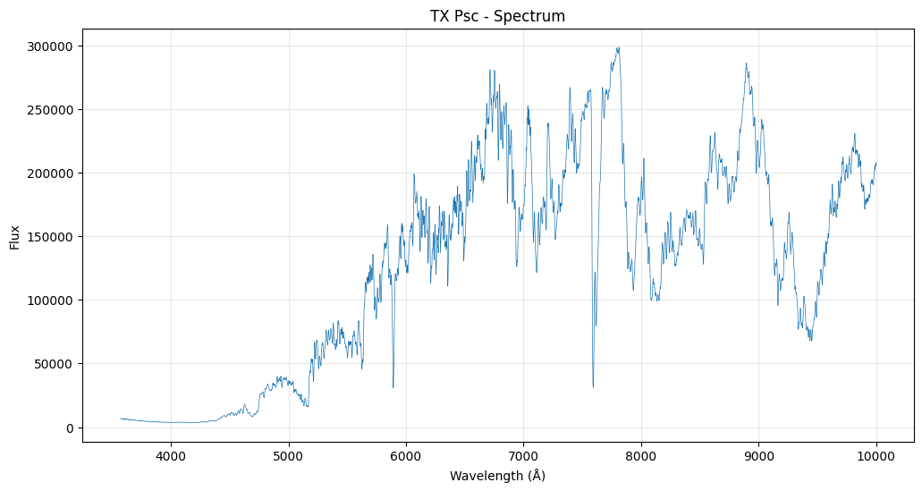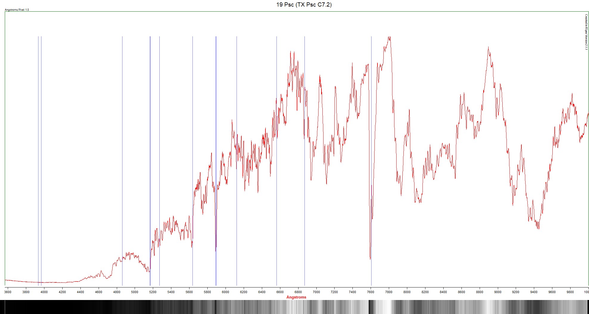 TX Piscium (19 Psc) is a very red star, 2.6 magnitudes fainter at blue wavelengths than in the middle of the visual range, and another 3.3 magnitudes fainter in the ultraviolet.[5] It has been given a spectral class C7,2, indicating a relatively cool carbon star with only modest C2 band strength.[4] It has alternately been classified as C-N5 C24, suggesting a warmer star with stronger C2 bands.[8] Spectral features have been observed to vary. (Wiki)