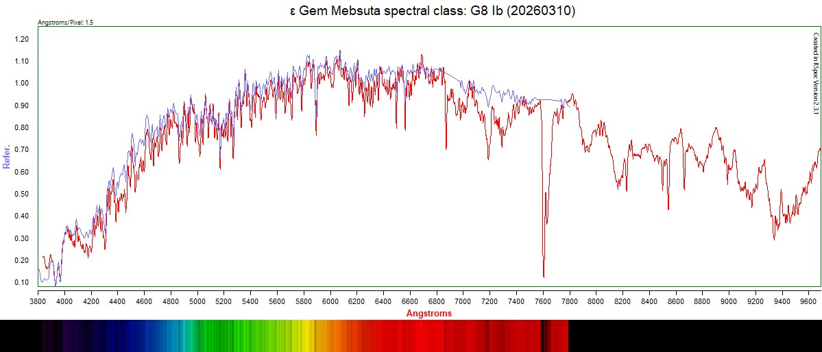 Epsilon Geminorum. At Epsilon Geminorum's distance, extinction from interstellar dust is causing a magnitude reduction of 0.27.[7] The spectrum of this star matches a stellar classification of G8 Ib,[3] where the luminosity class of Ib indicates this is a lower luminosity supergiant star. Alternatively, it may be a star that has passed through the asymptotic giant branch stage and possesses a detached shell of dust.[19] It has 5.3 times the mass of the Sun and it is estimated to be 100 million years old.[8] Since 1943, the spectrum of this star has served as one of the stable anchor points by which other stars are classified. (source: Wikipedia)
