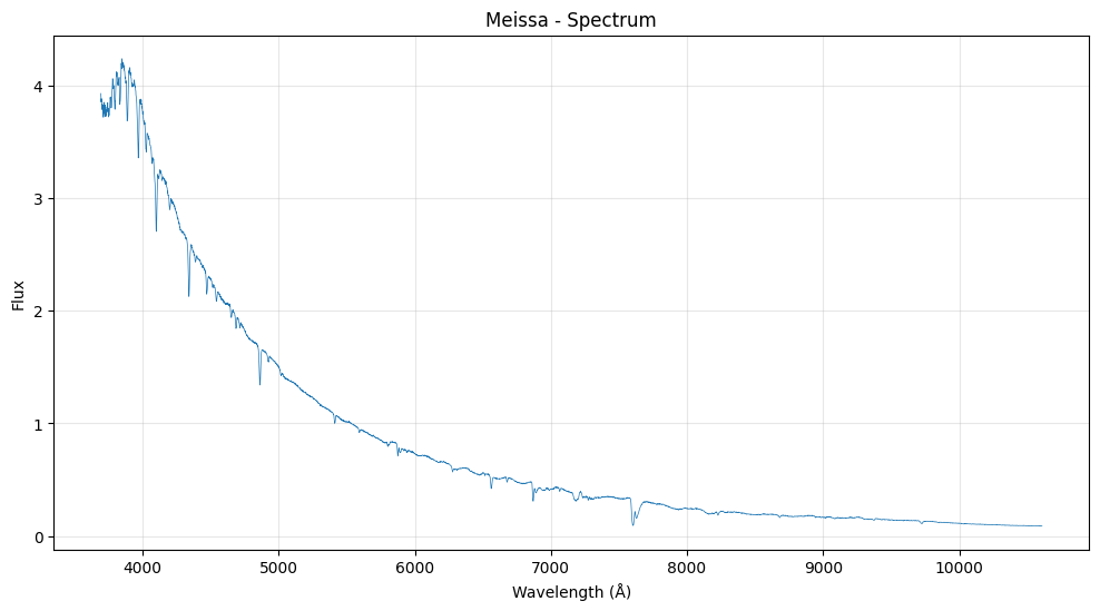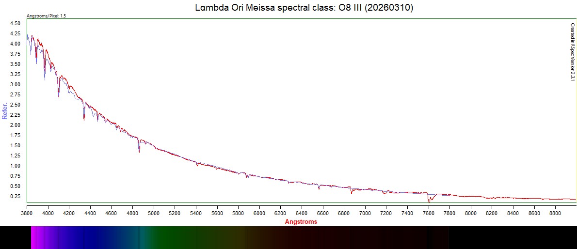 Lambda Ori, Heka or Meissa is a giant star with a stellar classification of O9 III and an apparent visible magnitude 3.54. It is an enormous star with about 34[7] times the mass of the Sun and 10 times the Sun's radius. The outer atmosphere has an effective temperature of around 35,000 K,[8] giving it the characteristic blue glow of a hot O-type star.[19] Meissa is a soft X-ray source with a luminosity of 1032 erg s−1 and peak emission in the energy range of 0.2–0.3 keV, which suggests the X-rays are probably being generated by the stellar wind.[20] The stellar wind of Meissa is well characterized by a mass-loss rate of 2.5×10−8 solar masses per year and a terminal velocity of 2,000 km/s. (source: Wikipedia)